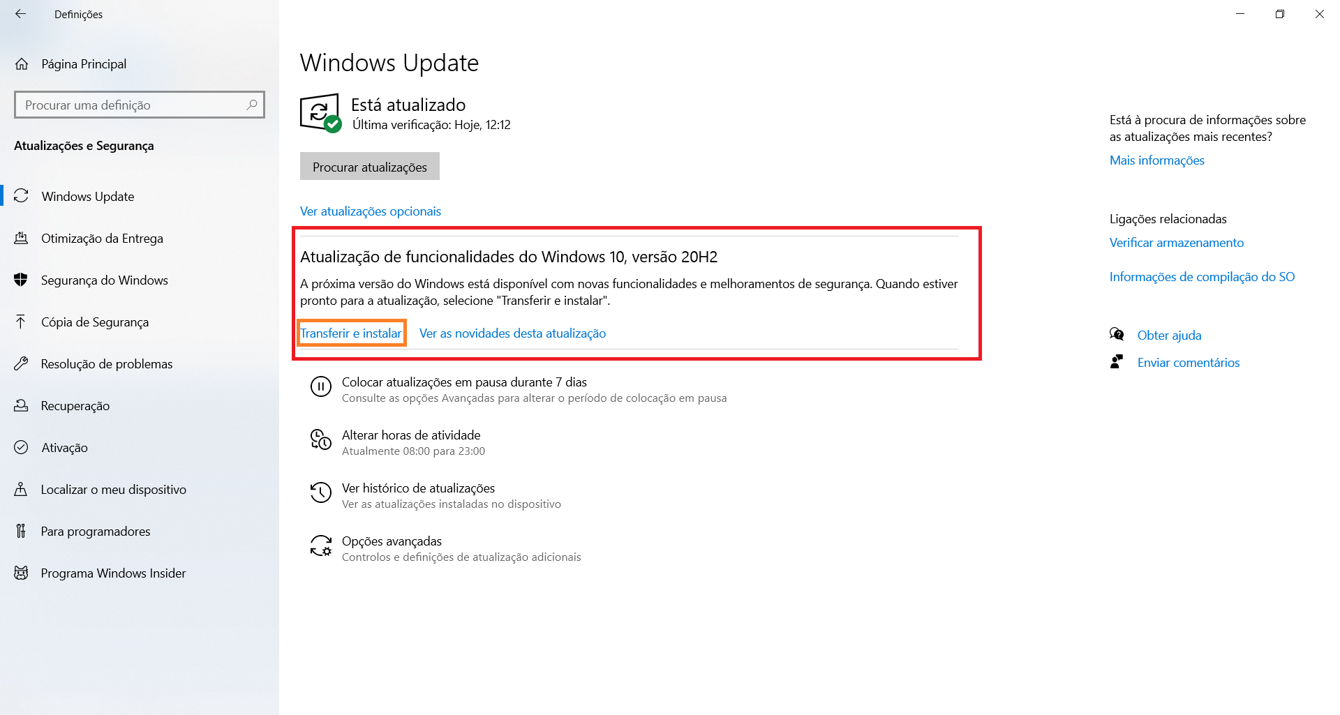 - Clicando em Actualizações e Segurança e procurando por actualizações, no painel de Definições. Se tem uma versão antiga do Windows 10 é possível que tenha que instalar várias actualizações até chegar à 20H2.