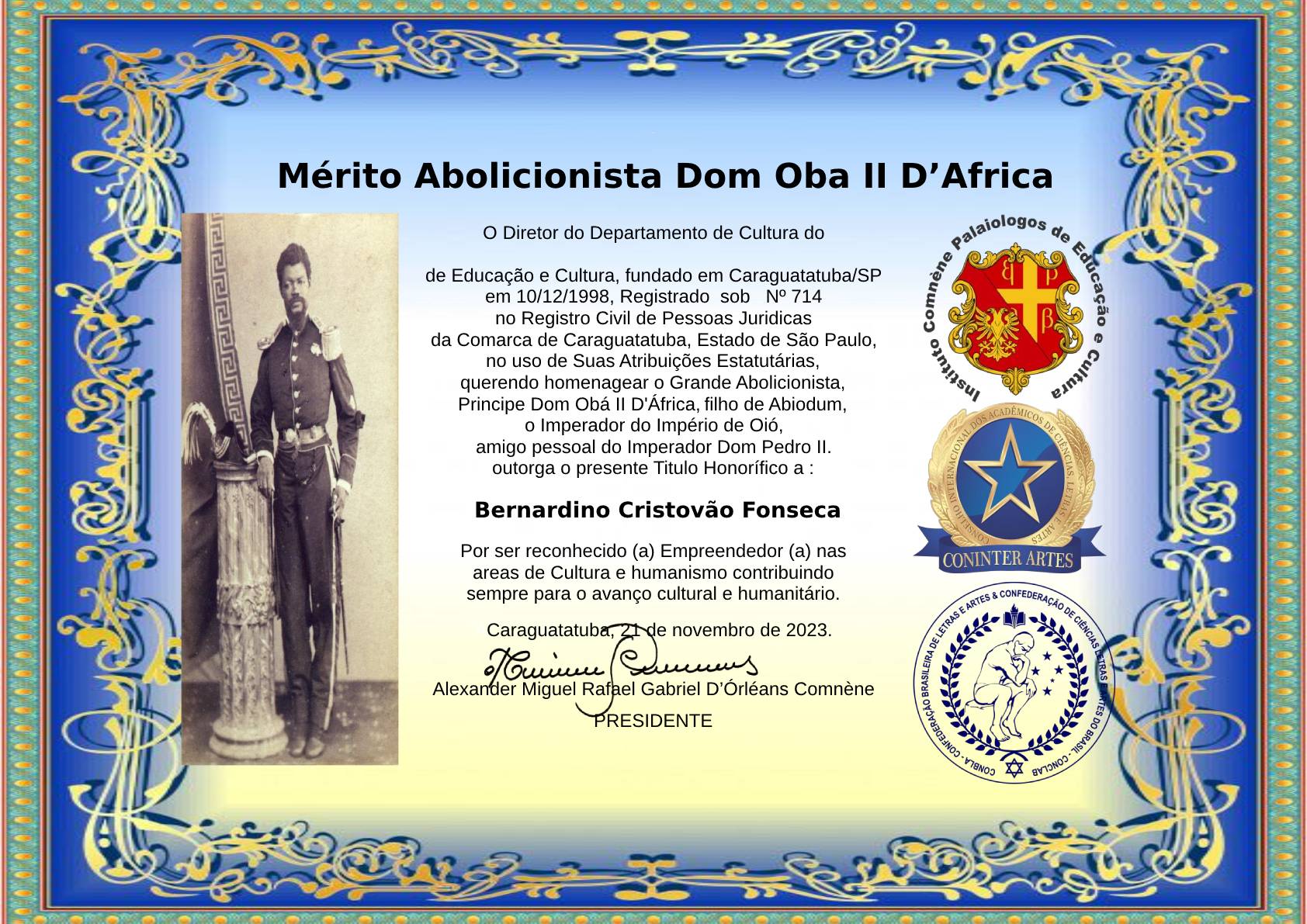 Bernardino Cristóvão da Fonseca foi novamente homenageado pelo Instituto Commène Palaiologos de Educação e Cultura – Caraguatatuba – São Paulo – Brasil, desta vez com o diploma de Mérito Abolicionista Dom Obá II D’África, filho de Abiodum, o imperador do Império de Oió, amigo pessoal do imperador Dom Pedro II, “por ser reconhecido empreendedor nas áreas de Cultura e Humanismo contribuindo sempre para o avanço cultural e humanitário”.