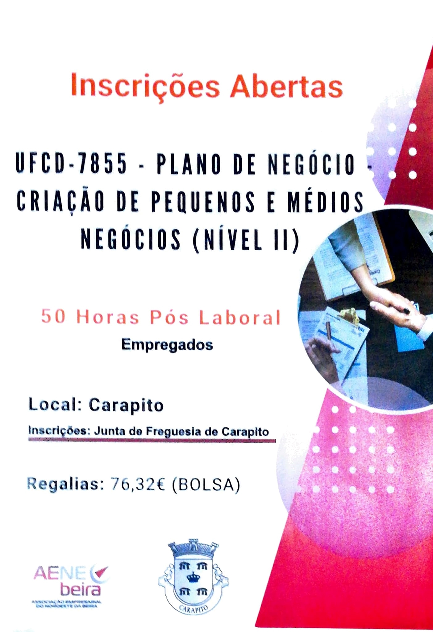 Estão abertas as inscrições para a unidade de formação de curta duração “Plano de Negócio – Criação de pequenos e médios negócios“, que irá decorrer na Junta de Freguesia de Carapito, em regime pós-laboral.