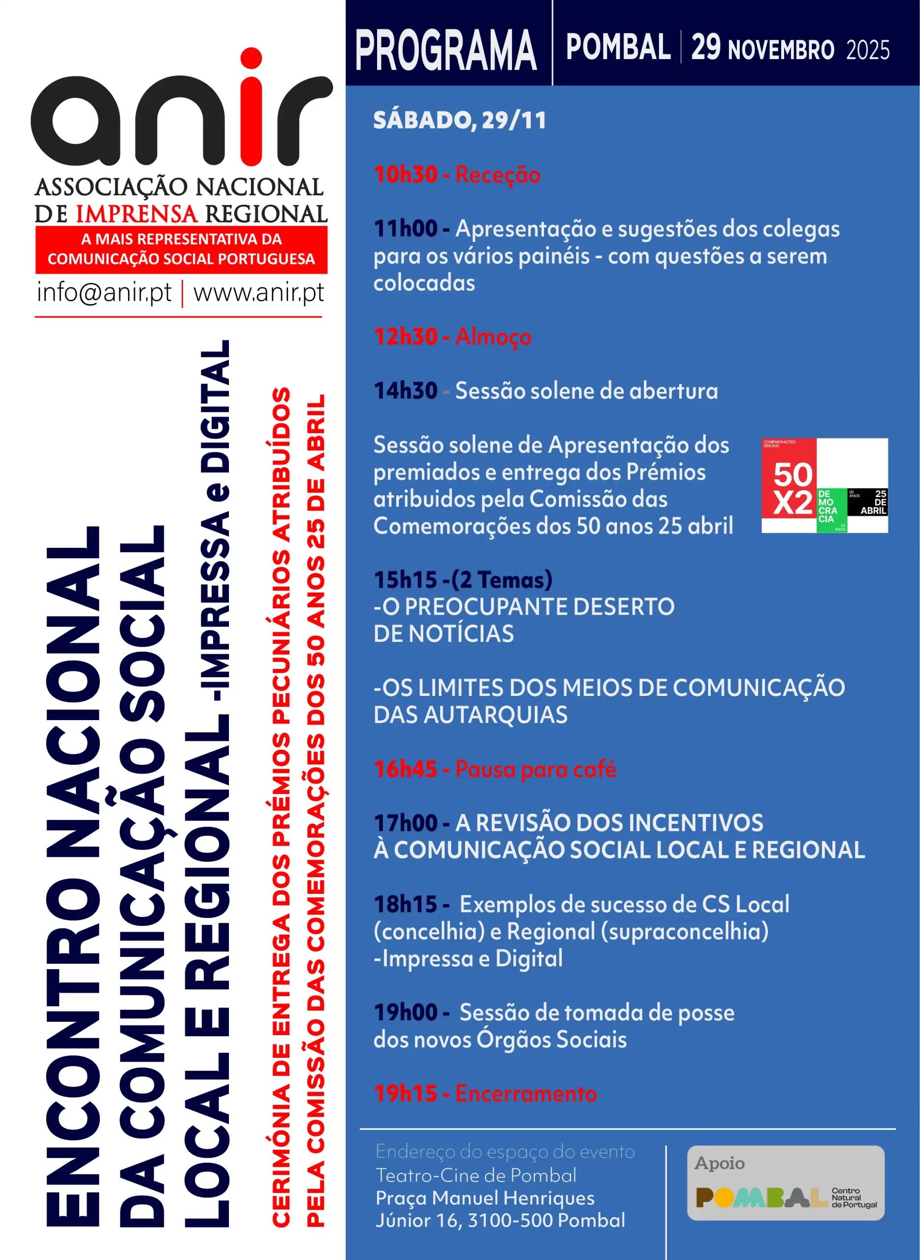 Pombal será, este sábado, 29 de novembro, o local de encontro da comunicação social de proximidade em Portugal, ao receber o Encontro Nacional da Comunicação Social Local e Regional — impressa e digital, uma iniciativa promovida pela ANIR — Associação Nacional de Imprensa Regional.